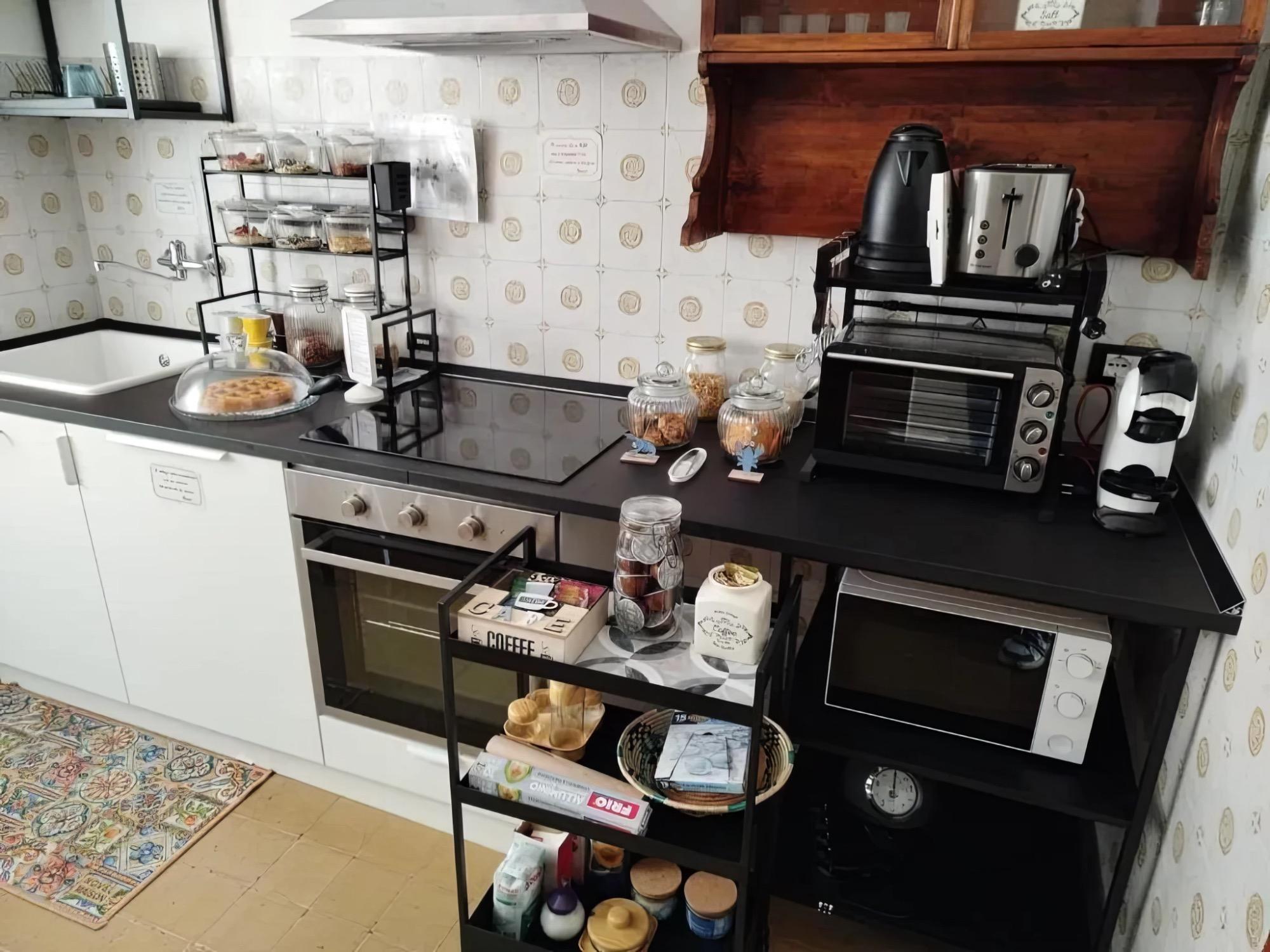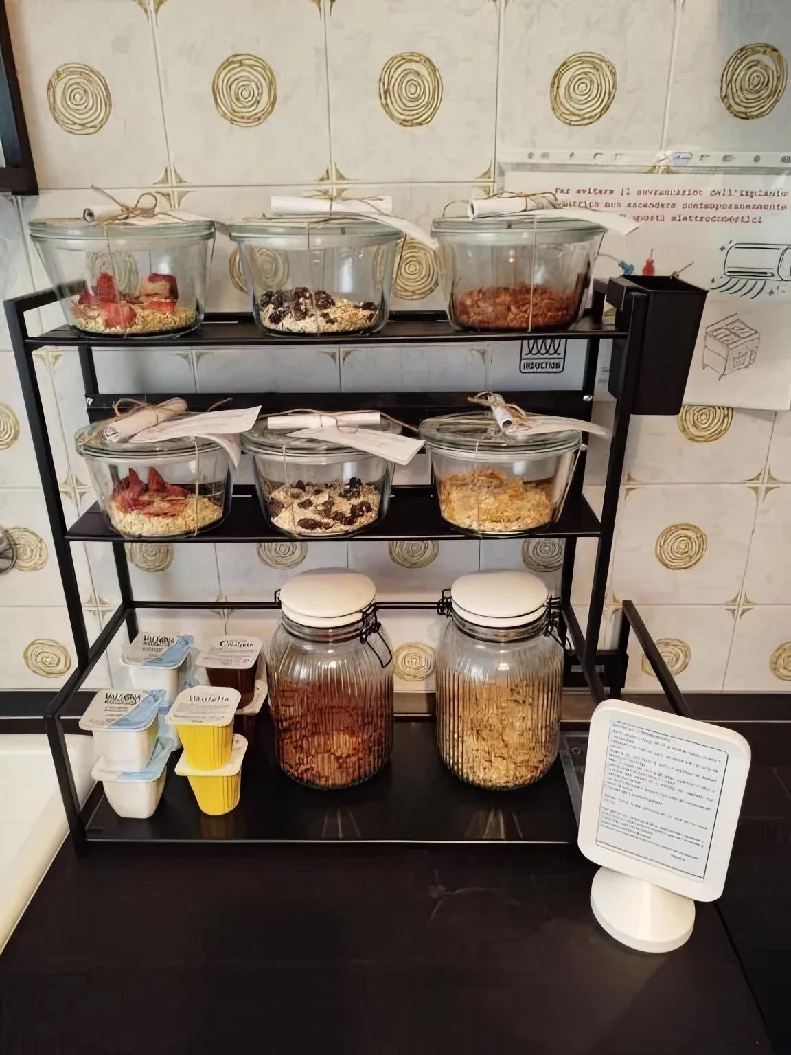 La colazione è pensata per offrire un risveglio piacevole e rilassato, con un buffet che unisce varietà e semplicità. Nella sala dedicata troverai un assortimento di dolci da forno, torte, brioche, biscotti, pane tostato con confetture, miele e creme spalmabili, insieme a cereali, fiocchi d’avena, granola e porridge preparato in casa. Sono disponibili bevande calde e fredde come caffè, cappuccino, tè, latte, cioccolata, succhi e mousse, oltre a un angolo attrezzato con microonde, bollitore, tostapane, fornetto e caffettiera per preparare la tua bevanda preferita. Per chi ha esigenze alimentari specifiche sono presenti prodotti confezionati senza glutine e bevande vegetali. Le preparazioni “home made”, prive di burro, latte vaccino e uova, offrono un’opzione gustosa anche a chi segue un’alimentazione vegana o ha particolari intolleranze.